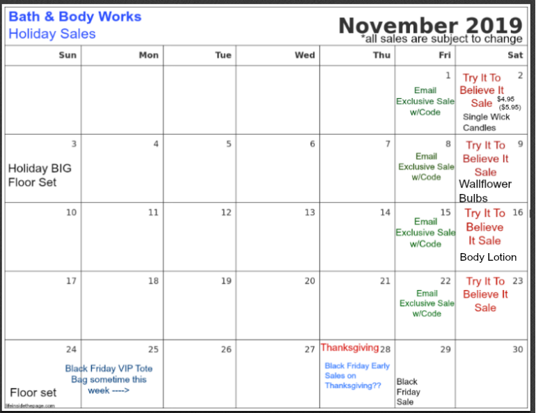 Life Inside the Page Bath & Body Works Calendar of Sales 2019 Try