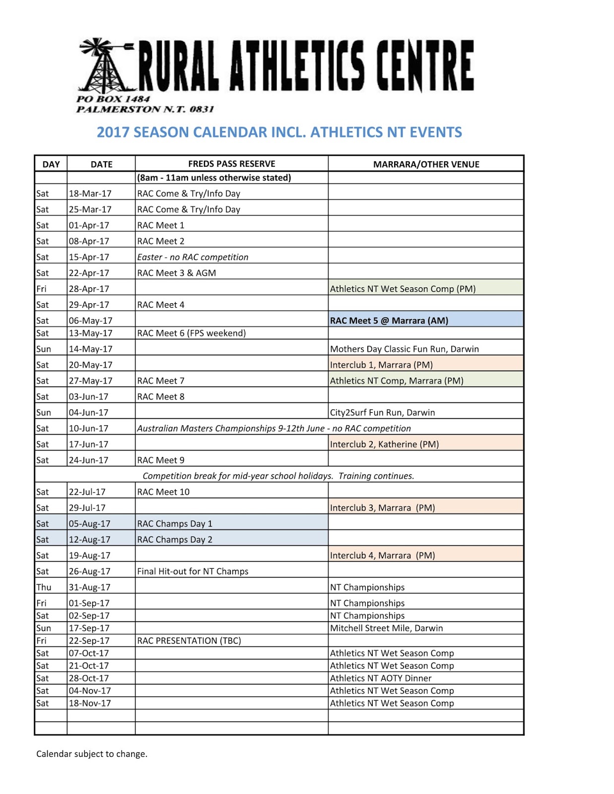 RURAL ATHLETICS CENTRE RAC Season calendars