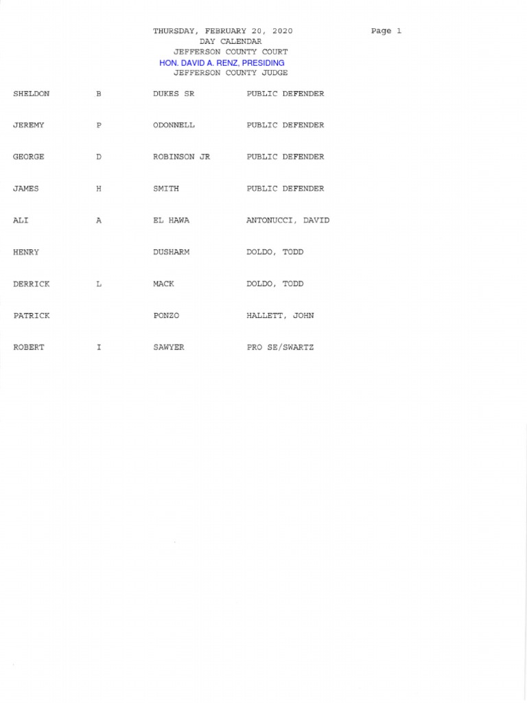 Jefferson County Court calendar Feb. 20, 2020