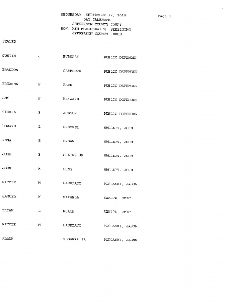 Jefferson County Court calendar Sept. 12, 2018