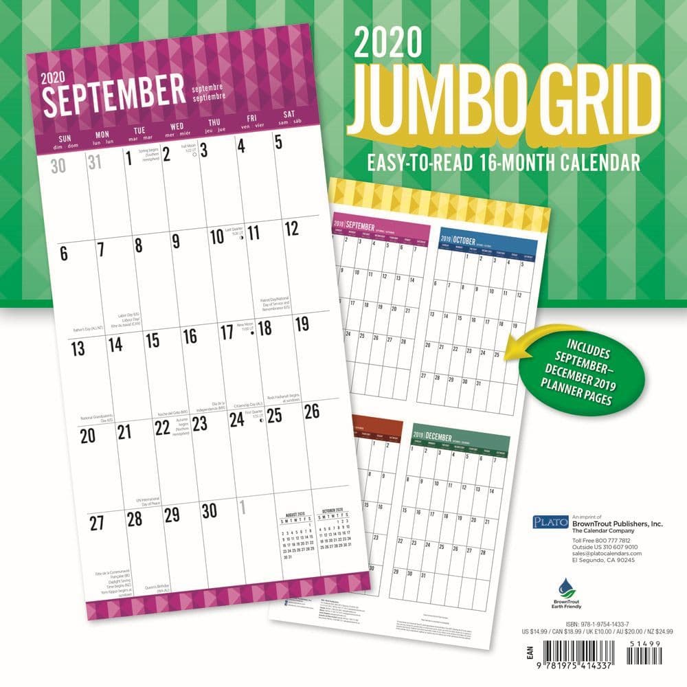Jumbo Grid Large Print 2020 12 x 12 Inch Monthly Square Wall Calendar
