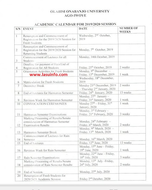 OAU Releases Academic Calendar for 2019/2020 Rain Semester Inside OAU
