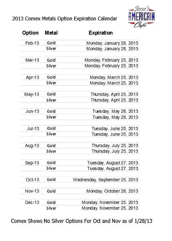 Jesse's Café Américain Gold and Silver Option Expiration Calendar for 2013