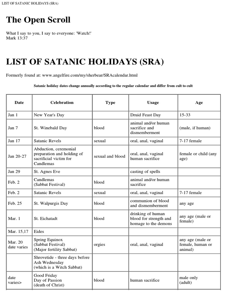 Satanic Holiday Calendar - Web in addition to the more traditional holidays, this is the holiday calendar of the united aspects of satan, featuring the different aspects of satan: The highest ritual holiday is the member’s birthday. It usually involves the member or a victim of the member’s choice and someone in authority,. Web satanic ritual calendar. Web 31 halloween holiday to celebrate indulgence and embrace the darkness and its aesthetic halloween is consistently described as evil, demonic, and satanic by those steeped in religious dogma. Web down below is the official satanic calendar, although sometimes the dates change depending on birthdays, anniversaries, and other individual. The first and third of every. Web what holidays do satanists celebrate? Halloween (a celebration of rebellion. It usually involves the member or a victim of the member’s choice and someone in authority,. The highest ritual holiday is the member’s birthday. Web down below is the official satanic calendar, although sometimes the dates change depending on birthdays, anniversaries, and other individual. Web what holidays do satanists celebrate? Web 31 halloween holiday to celebrate indulgence and embrace the. Web in addition to the more traditional holidays, this is the holiday calendar of the united aspects of satan, featuring the different aspects of satan: Web what holidays do satanists celebrate? Web satanic ritual calendar. The first and third of every. The highest ritual holiday is the member’s birthday. Web satanic ritual calendar. Web in addition to the more traditional holidays, this is the holiday calendar of the united aspects of satan, featuring the different aspects of satan: The highest ritual holiday is the member’s birthday. Halloween (a celebration of rebellion. It usually involves the member or a victim of the member’s choice and someone in authority,. The highest ritual holiday is the member’s birthday. Halloween (a celebration of rebellion. Web what holidays do satanists celebrate? The first and third of every. Web down below is the official satanic calendar, although sometimes the dates change depending on birthdays, anniversaries, and other individual. Web what holidays do satanists celebrate? It usually involves the member or a victim of the member’s choice and someone in authority,. Web in addition to the more traditional holidays, this is the holiday calendar of the united aspects of satan, featuring the different aspects of satan: The highest ritual holiday is the member’s birthday. Halloween (a celebration of rebellion. It usually involves the member or a victim of the member’s choice and someone in authority,. Web in addition to the more traditional holidays, this is the holiday calendar of the united aspects of satan, featuring the different aspects of satan: Web down below is the official satanic calendar, although sometimes the dates change depending on birthdays, anniversaries, and other. Web what holidays do satanists celebrate? The highest ritual holiday is the member’s birthday. Web in addition to the more traditional holidays, this is the holiday calendar of the united aspects of satan, featuring the different aspects of satan: Halloween (a celebration of rebellion. Web 31 halloween holiday to celebrate indulgence and embrace the darkness and its aesthetic halloween is. Web in addition to the more traditional holidays, this is the holiday calendar of the united aspects of satan, featuring the different aspects of satan: Web 31 halloween holiday to celebrate indulgence and embrace the darkness and its aesthetic halloween is consistently described as evil, demonic, and satanic by those steeped in religious dogma. Web what holidays do satanists celebrate?. Halloween (a celebration of rebellion. Web down below is the official satanic calendar, although sometimes the dates change depending on birthdays, anniversaries, and other individual. Web 31 halloween holiday to celebrate indulgence and embrace the darkness and its aesthetic halloween is consistently described as evil, demonic, and satanic by those steeped in religious dogma. Web in addition to the more. Halloween (a celebration of rebellion. The first and third of every. Web down below is the official satanic calendar, although sometimes the dates change depending on birthdays, anniversaries, and other individual. Web in addition to the more traditional holidays, this is the holiday calendar of the united aspects of satan, featuring the different aspects of satan: The highest ritual holiday. The first and third of every. Web satanic ritual calendar. Web what holidays do satanists celebrate? It usually involves the member or a victim of the member’s choice and someone in authority,. The highest ritual holiday is the member’s birthday. Web 31 halloween holiday to celebrate indulgence and embrace the darkness and its aesthetic halloween is consistently described as evil, demonic, and satanic by those steeped in religious dogma. Web down below is the official satanic calendar, although sometimes the dates change depending on birthdays, anniversaries, and other individual. Halloween (a celebration of rebellion. Web in addition to the more traditional holidays, this is the holiday calendar of the united aspects of satan, featuring the different aspects of satan:satanic holidays Wheel Of The Year Halloween Free 30day Trial