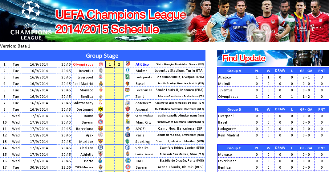 Free Download UEFA Champions League 2014/2015 Schedule (File Excel)